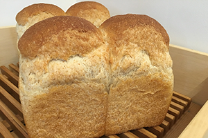 山型食パン 卵、乳製品を使わず焼いた食パン。プレーン、全粒粉、胚芽(土曜日のみ)、くるみ(水曜日のみ)の4種類があります。